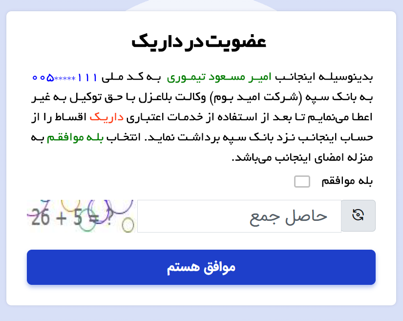 4. وکالت نامه استفاده از خدمات اعتباری داریک را با زدن تیک قسمت "بله موافقم" و وارد نمودن حاصل جمع دو عدد نمایش داده شده و زدن کلید موافق هستیم تایید فرمایید.